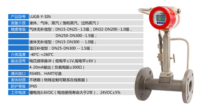 LUGB-Y-SIN抗震振渦街流量儀表廣泛用于供熱公司、熱力公司、化工行業等行業,對過熱蒸汽、飽和蒸汽、壓縮空氣和一般氣體、水和液體的計量和控制。加厚本體,可有效避免現場管道振動帶來的數據波動和誤差。