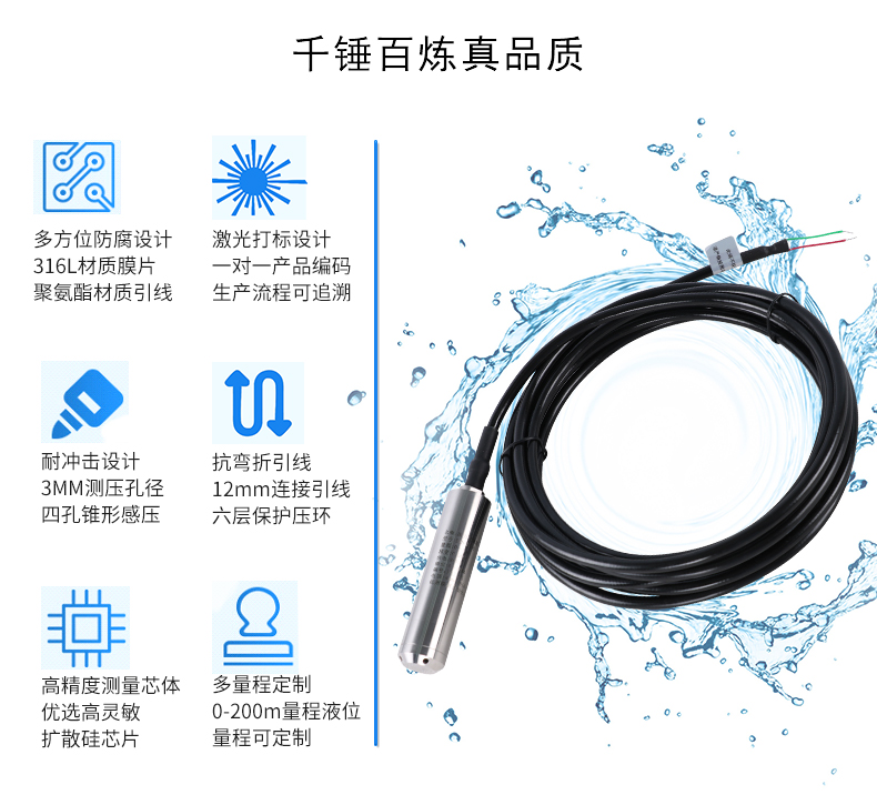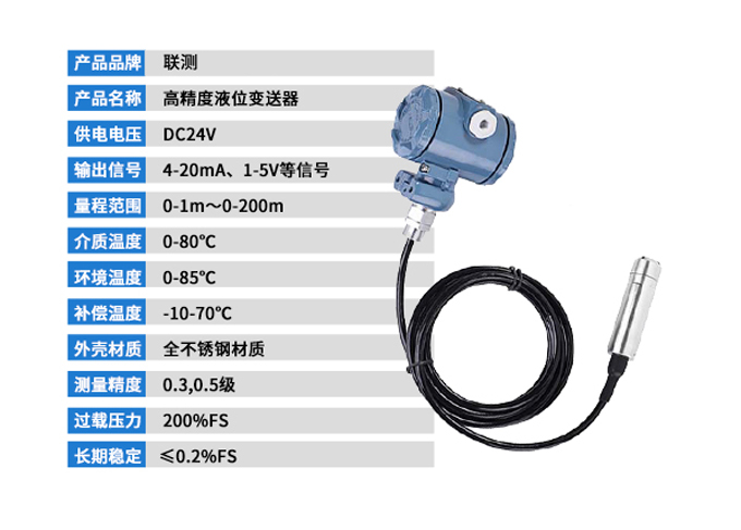SIN-P261投入式液位變送器由高性能擴散硅壓阻式壓力傳感器作為測量元件,把與液位深度成正比的液體靜壓力準(zhǔn)確測量出來,并經(jīng)過信號調(diào)理電路轉(zhuǎn)換成標(biāo)準(zhǔn)(電流或電壓)信號輸出,建立起輸出信號與液體深度的線性對應(yīng)關(guān)系,實現(xiàn)對液體深度的測量。產(chǎn)品精度高、體積小,直接投入液體中,即可測量出變送器末端到液面的液體高度,使用方便。適用于石油、化工、電廠、城市供水、水文勘探領(lǐng)域的液位測量與控制。經(jīng)過長期老化及穩(wěn)定性篩選,產(chǎn)品性能穩(wěn)定可靠,能夠適用應(yīng)用于環(huán)境比較惡劣的露天現(xiàn)場,同時能夠現(xiàn)場液位顯示,零點,滿程可遷移。